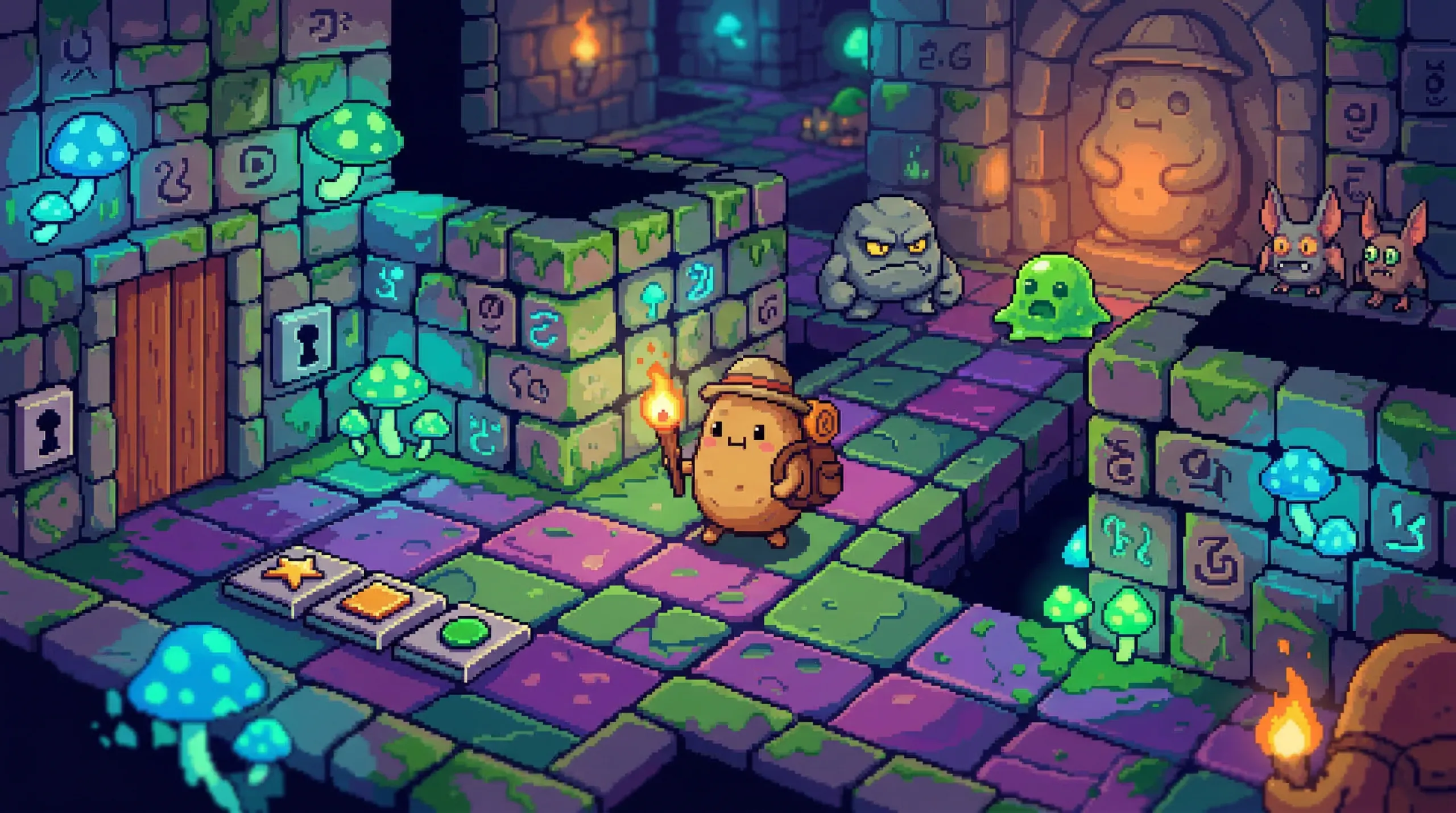 The narrative is as straightforward as its vegetable hero: Spud, a potato, must journey through a series of monster-filled dungeons and towns to rescue the captured Princess Mato from King Wart. Along the way, Spud can recruit a varied cast of supporting characters — including a carrot named Ringo and a mushroom called Mush — each with different abilities that are useful in different situations. The world is populated entirely by anthropomorphic vegetables, giving the game a distinctive, surreal visual identity that sets it apart from anything else on the platform.